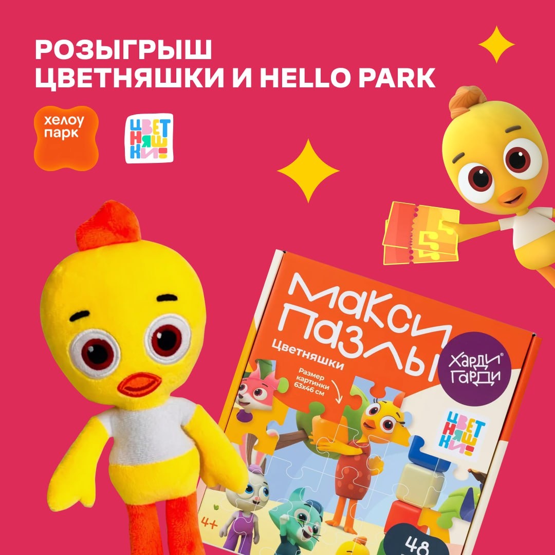 Цветняшки и сеть парков «Hello Park» хотят порадовать вас яркими призами! ❤️ Мы организовали конкурс в запретограме с очень классными призами: 🏆 1 место: Билеты в «Hello Park» на двоих и плюшевую игрушку с Цыпленком Пи 🥈 2 место: Билет в «Hello Park» и пазлы с героями «Цветняшек» Условия супер простые! Ознакомиться с ними и принять участие в конкурсе можно по ссылке: 👇👇👇 🔥 Участвовать в конкурсе! 🔥