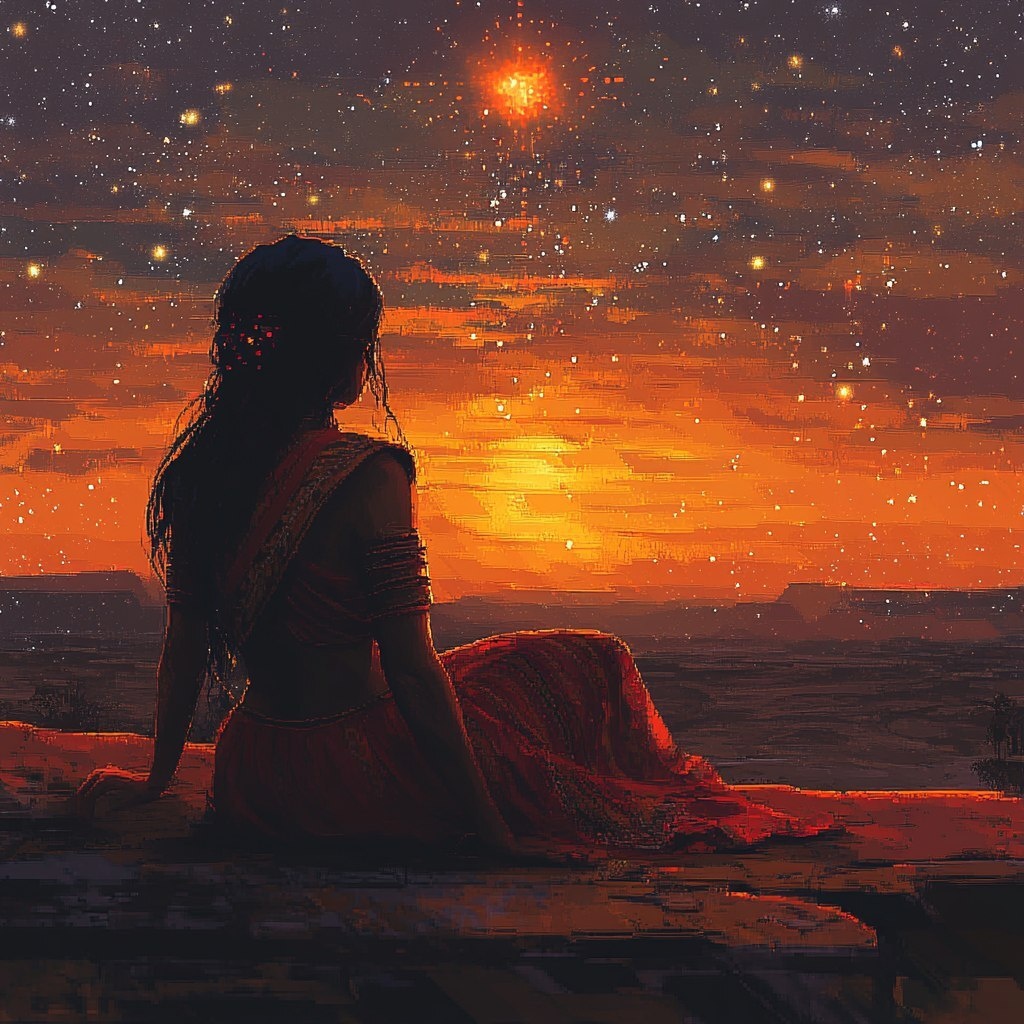 Создано на основе запроса: a beautiful indian girl looking into a digital desert mirage, pixelated, cinematic, stars, sunset, anime style, day dream, movie poster, centered