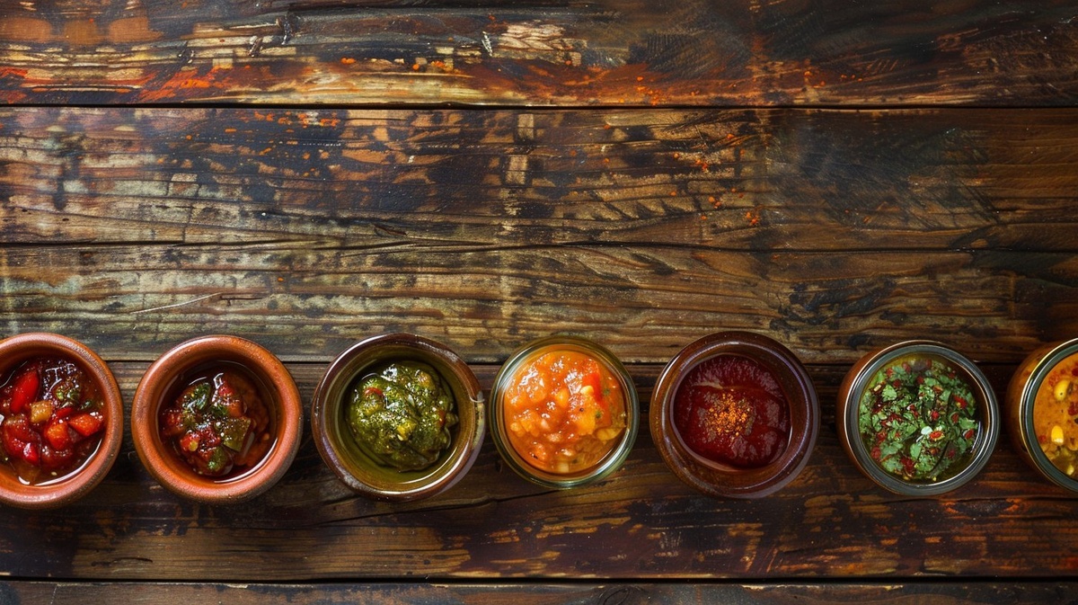 Создано на основе запроса: "Rustic wooden background, warm and natural wood grain, slightly aged texture. At the bottom corner, a small selection of traditional Mexican homemade salsas in glass jars and clay bowls, vibrant colors like red, green, and orange. No labels, no text, no additional elements. The rest of the background remains clean and empty, ready for design use.