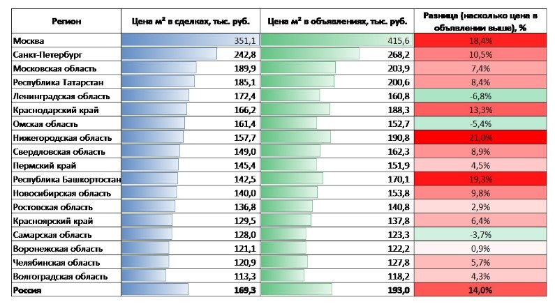В следующей таблице от Дом.Клик показана разница между ценой реальных сделок и ценой в объявлениях в разрезе регионов.