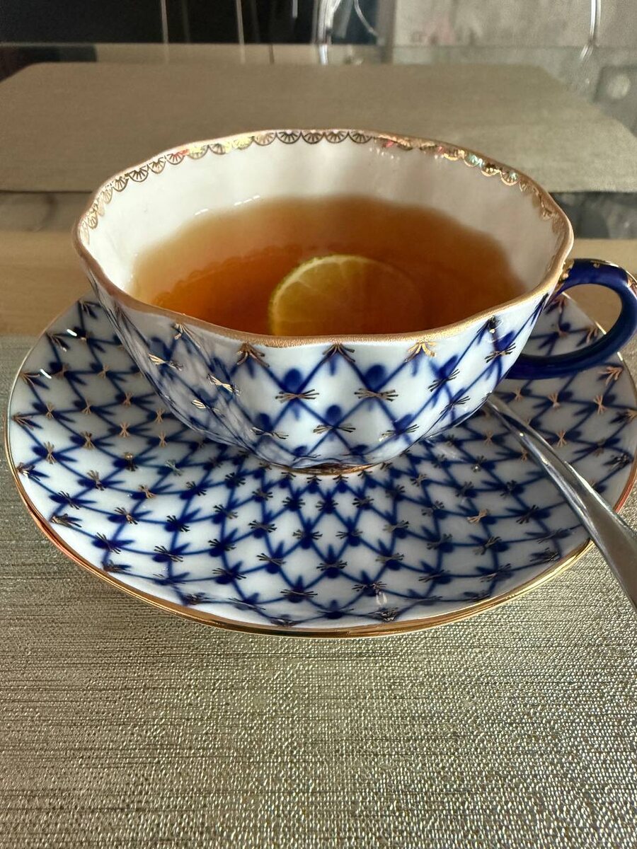 Я часто тепло вспоминаю , как пила чай в «Астории» перед балетом в Мариинке из тончайшей чашки с синими ромбиками, потому что каждый день пью чай из такой чашки дома.