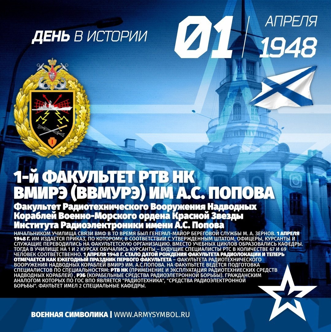 1 факультет ВМИРЭ А.С.Попова с 1948 1 Факультет (радиотехнического вооружения, радиоэлектронной борьбы надводных кораблей) Военно-морского ордена Красной Звезды института радиоэлектроники имени А.С. Попова Начальником Училища связи ВМФ в то время был генерал-майор береговой службы М. А. Зернов. 1 апреля 1948 г. им издается приказ, по которому, в соответствии с утвержденным штатом, офицеры, курсанты и служащие переводились на факультетскую организацию. Вместо учебных циклов образовались кафедры. Тогда в училище на 1 и 2 курсах обучались курсанты – будущие специалисты РТС в количестве 67 и 69 человек соответственно. 1 апреля 1948 г. стало датой рождения факультета радиолокации и теперь отмечается как ежегодный праздник первого факультета – факультета радиотехнических средств надводных кораблей ВМИРЭ им. А.С.Попова. #ПамятныеДатыВоеннойИсторииОтечества #ДеньВИстории #ГодЗащитникаОтечества #80ЛетВеликойПобед Подпишитесь на наши группы ВКонтакте и в Одноклассниках - читайте, смотрите и к