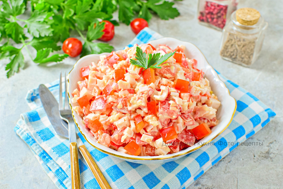 Простой в приготовлении с доступными продуктами. Легкий и сочный - станет отличным дополнением для любого стола. Все ингредиенты хорошо дополняют друг друга во вкусе. Для приготовления салата подготовьте необходимые ингредиенты. Пропорции можете немного изменить на свой вкус. Нарежьте крабовые палочки и выложите в салатник. Добавьте мелко нарезанный болгарский перец. Нарежьте помидоры. Сразу в салатник потрите на терке сыр. Добавьте измельченный лук. Заправьте салат майонезом и перемешайте. По желанию можно добавить соль и специи. Салат готов. Переложите его в подходящий салатник и подавайте к столу. Приятного аппетита! Рыба в панировке на сковороде Итальянский соус Маринара Картофель по-деревенски на сковороде