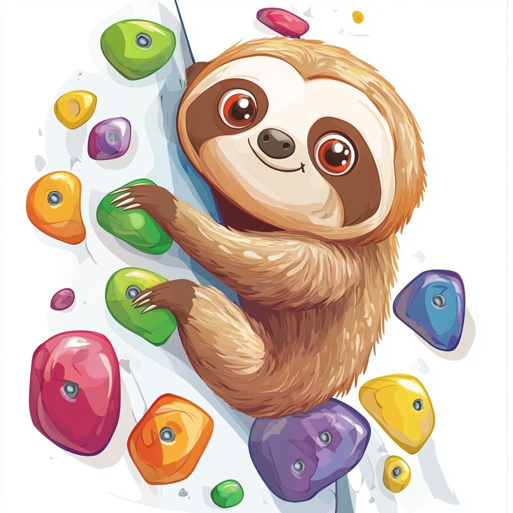 Создано на основе запроса: a cute sloth climbing in a rock climbing park, the rocks are colorful, drawing cartoon style, white background