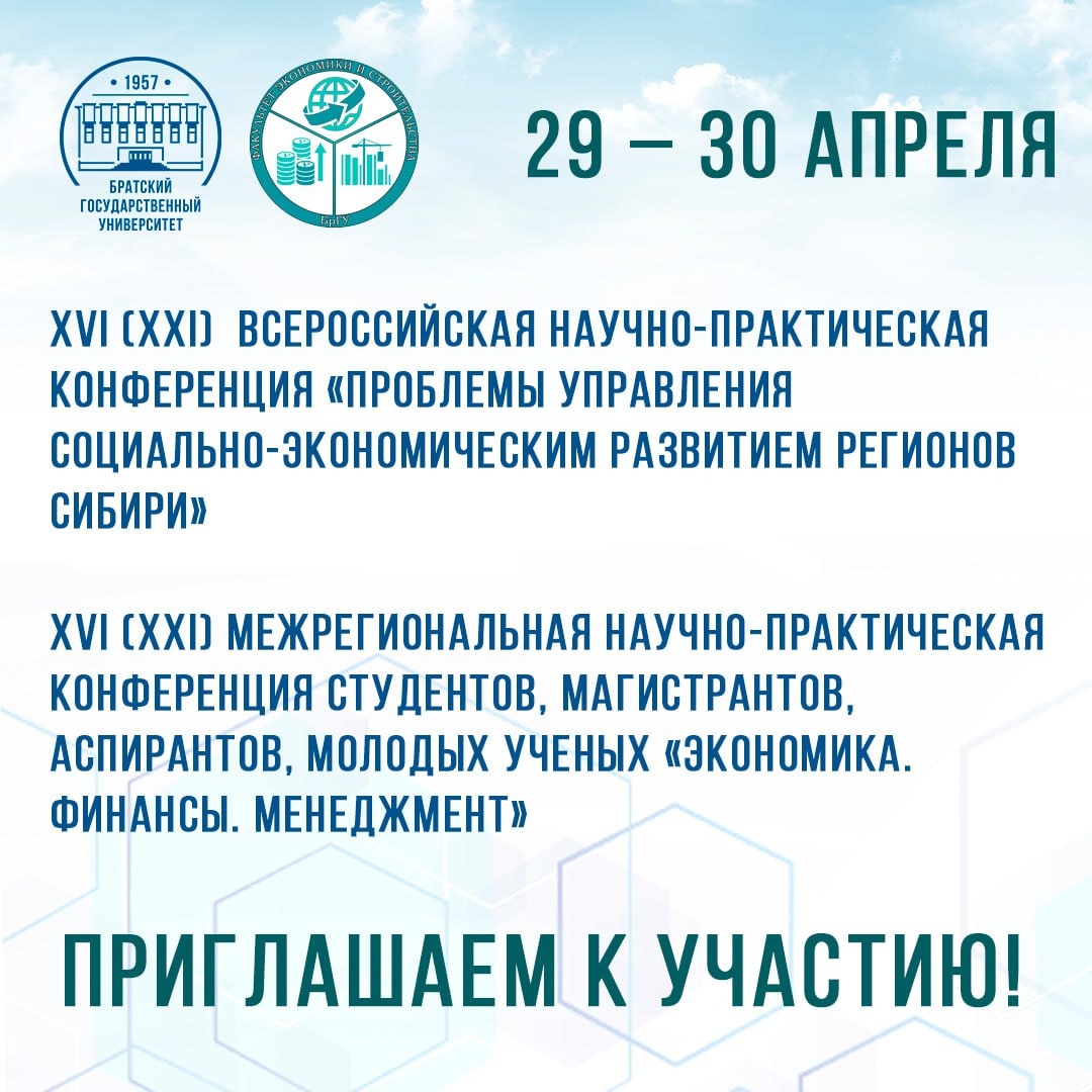 Приглашаем Вас стать участниками XVI (XXI) Всероссийской научно-практической конференции «Проблемы управления социально-экономическим развитием регионов Сибири» и XVI (XXI) Межрегиональной научно-практической конференции студентов, магистрантов, аспирантов, молодых ученых «Экономика. Финансы. Менеджмент», которые пройдут 29 – 30 апреля 2025 года.