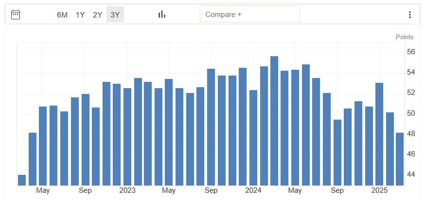 Предыдущий раз снижение ниже 50 пунктов произошло в сентябре 2024 года [49,5 пункта]. До этого непрекращающийся рост продолжался с апреля 2022 года.