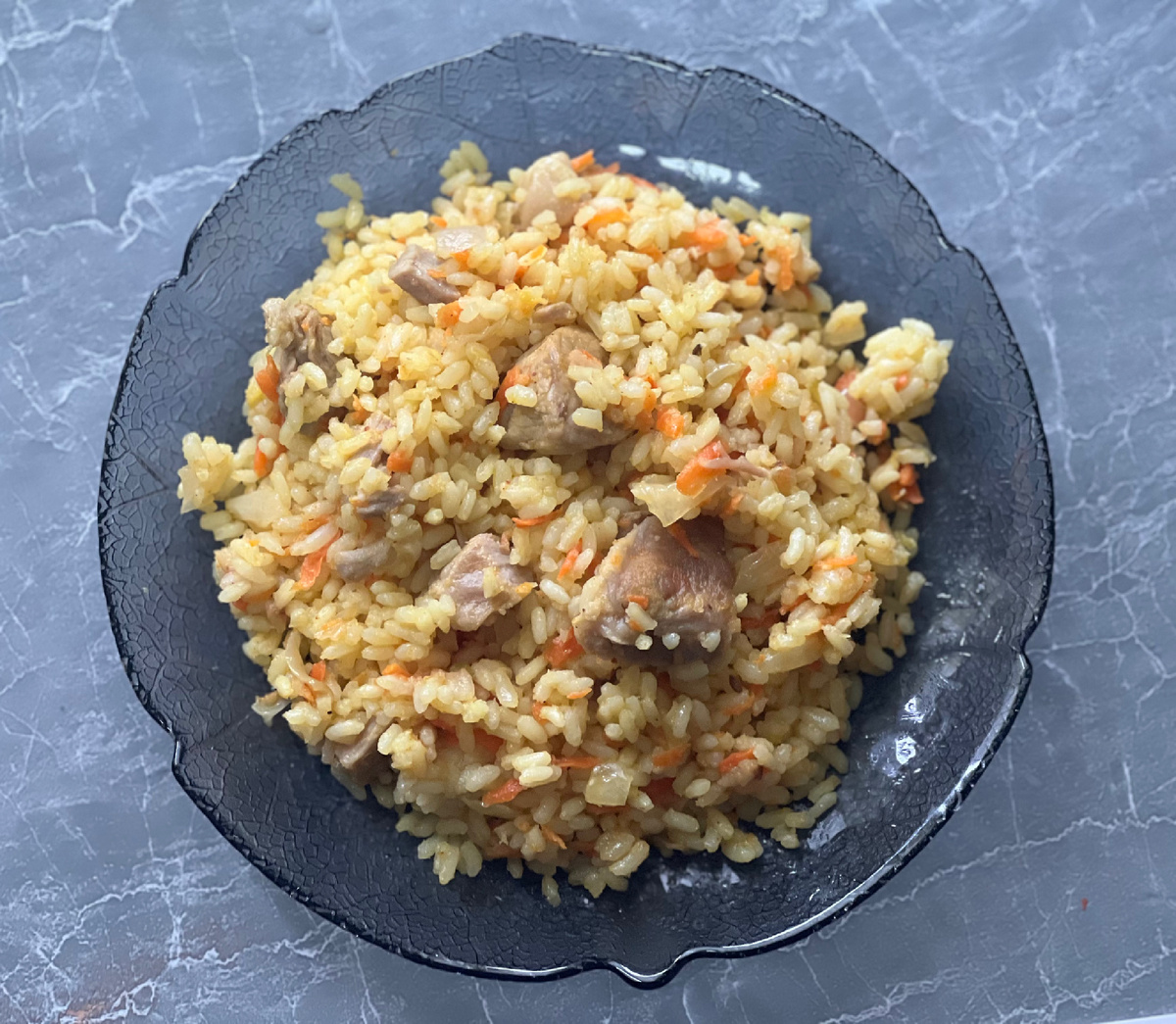 На выходных готовила «плов» или рисовую кашу с мясом. Название не принципиально для меня. У нас дома это называется быстрый плов. На правильном питании плов можно есть утром или в крайнем случае в обед. У меня это был завтрак. Ну вот я добралась я до самой сути. Мне понадобилось для приготовления: ☑️400гр пропаренного риса ☑️400гр свинины (хотя наверное было чуть больше) ☑️1 крупная луковица ☑️1 крупная морковь ☑️1 головка чеснока ☑️Уксус 9% (если есть время, можно без него) ☑️Масло горчичное / подсолнечное ☑️Соль, изюм, куркума, зира, лавр.лист и перец горошком и душистый / приправа для плова Сам процесс приготовления занимает минимум времени и усилий, а в результате выходит полноценное вкусное блюдо. ☑️Мясо промываю, нарезаю крупным кубиком в отдельную емкость, добавляю туда соль, перец горошком и душистый, ломаю лавр.лист, 1 ст.л уксуса и воды столько, чтобы покрывала мясо. ☑️Рис хорошо промываю и варю в пропорции на 1 чашку риса 1,5 чашки воды. Когда рис закипел добавила соль и