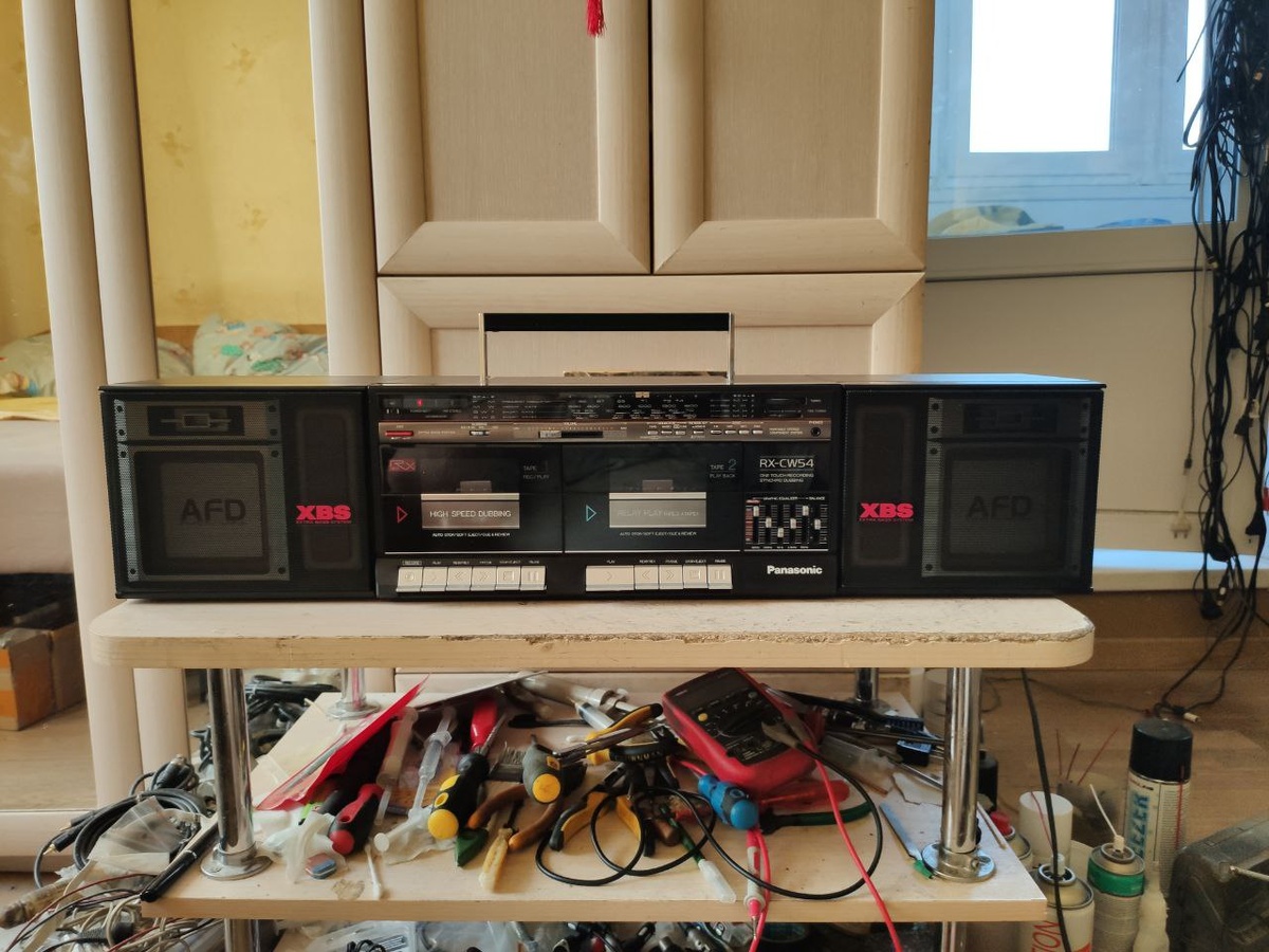 Panasonic RX-CW54.Батончик из березки, дайте два или отрежьте половину, это насколько чеков хватит. Но кроме березки, данный батон можно было приобрести ещё и во всяческих комиссионных магазинах или у фарцовщиков на тонированных восьмёрках. И если во времена Горби он ещё представлял какую-то ценность, то сейчас конечно уже далеко не топ и не объект желания, тем более без FM, с УКВ он вообще не интересует многих потребителей.Так что исправим этот недостаток, вернём в родной диапазон, благо делается это легко, достаточно выпаять С9 и С11, на место С9 впаять только что выпаянный С11, а в место катушки L1,поставить перемычку и не забывайте убрать родной полосовой фильтр на входе и поставить фильтр 88-108 или просто впаять кондерчик в несколько пикушек.Витки гетеродинной катушки разводим подальше, примерно как на фото и точно попадëте в диапазон и это будет не зеркальный канал и точная подстройка триммерами на КПЕ.Вот теперь FM на борту, стерео приём то же будет, отправляем батончик к открытию шашлычного сезона.