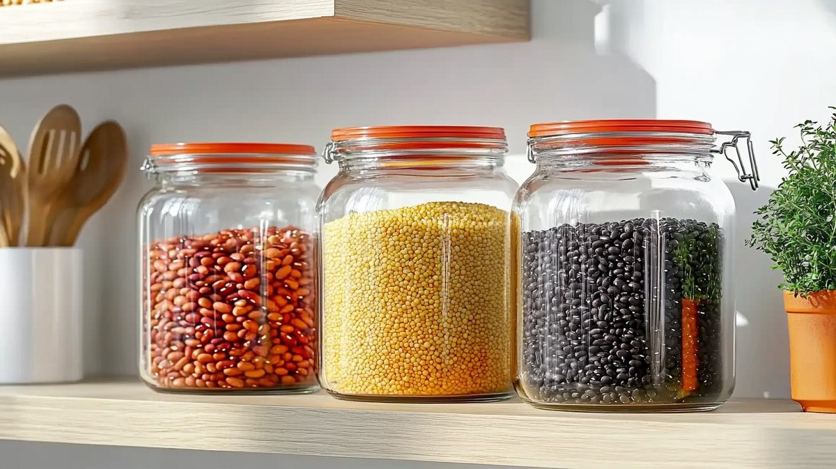Создано на основе запроса: There are three large round glass jars on the kitchen shelf, each containing red beans, yellow rice, and black quinoa, with tableware and a small pot of green plants next to them, bright white kitchen scene.