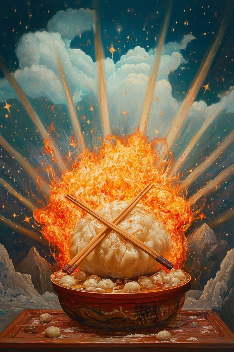 Создано на основе запроса: Giant dumpling with crossed chopsticks, on fire in front of a starburst