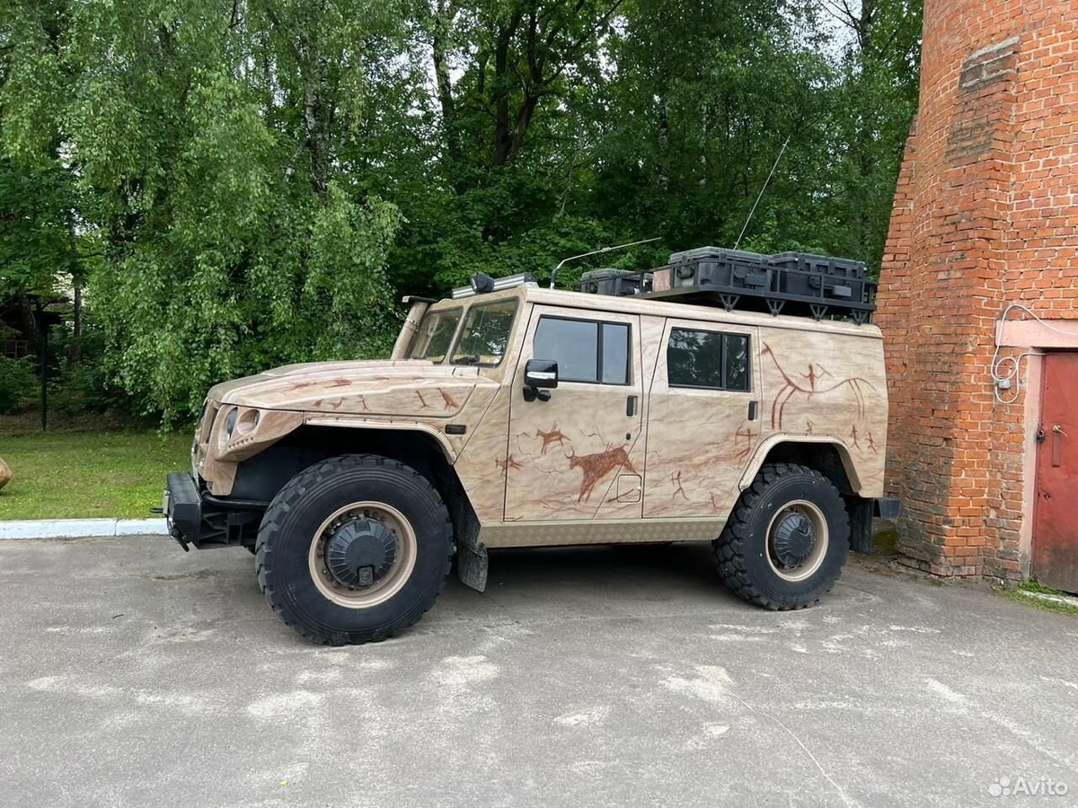 Утилитарный армейский джип с пробегом 20 тысяч километров оценили в 10 миллионов рублей. Уникальности машине 2004 года выпуска добавляет установленный в кабине душ с системой очистки воды и модернизированный салон, который в изобилии обит кожей и оборудован различной мультимедиа, телевизором и даже холодильником. Помимо прочего, авто обладает всеми необходимыми внедорожными опциями, такими как регулируемая пневмоподвеска, шноркель, два топливных бака и электронная лебедка. Под капотом расположен 6-цилиндровый дизельный мотор фирмы Cummins объемом 5,9 литра и мощностью 180 лошадиных сил, агрегатированный шестиступенчатой механической коробкой передач. Уникальный «Тигр» отличается специальной аэрографией в стилистике наскальных рисунков.