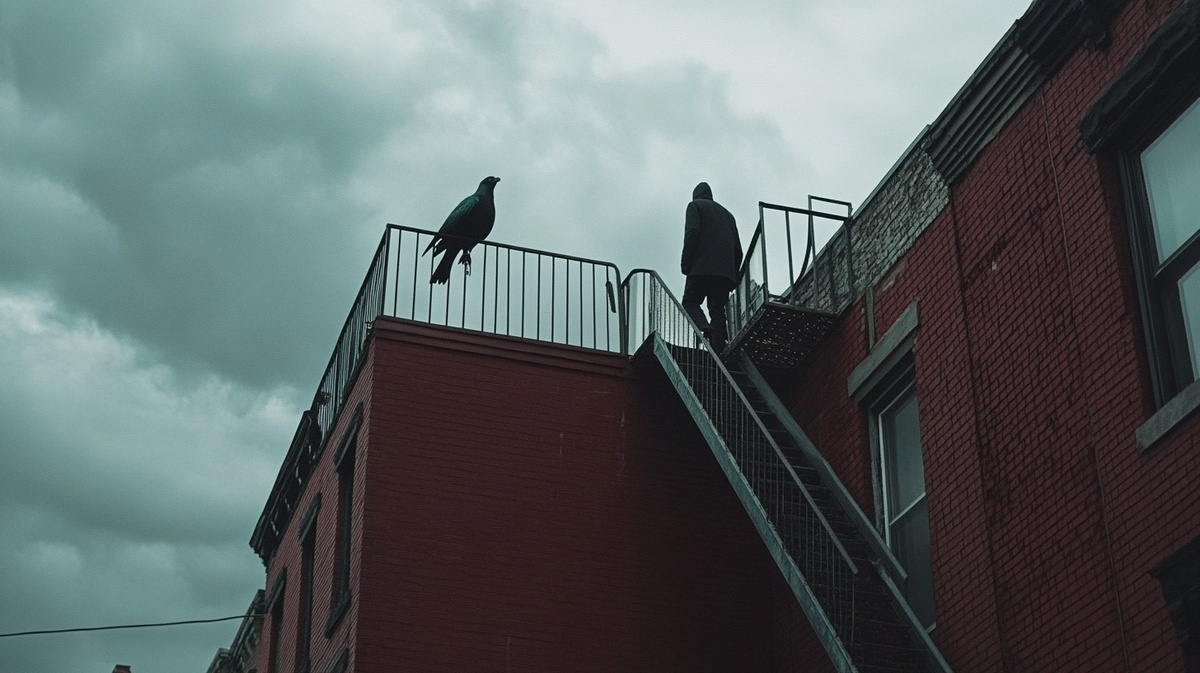 Создано на основе запроса: a wide shot of the bird-headed man walking up the outdoor stair, side view, red brick apartment behind him