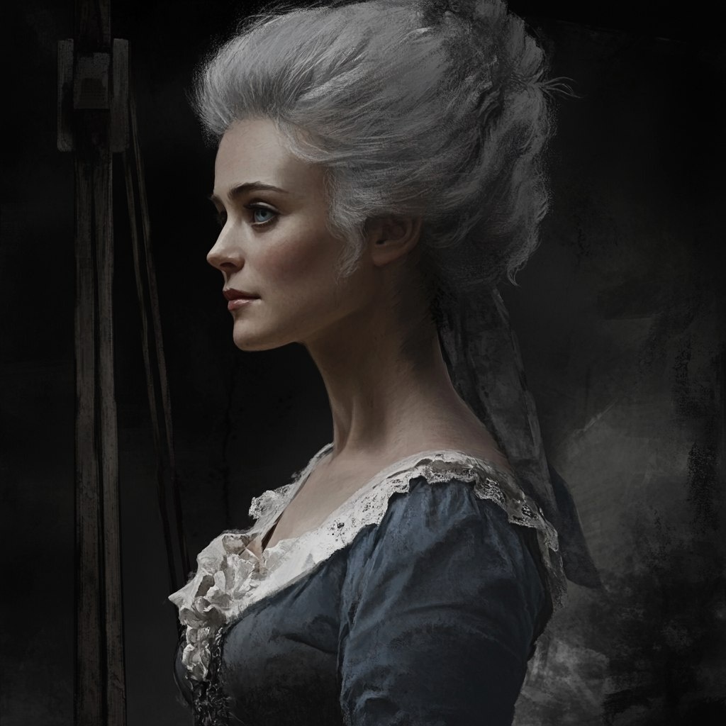 Создано на основе запроса: Close-up of Marie Antoinette, standing tall despite her fate