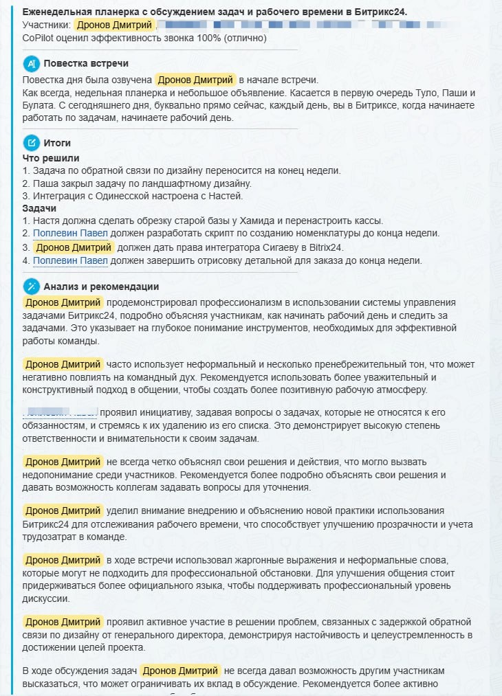 А вы пользуетесь в созвонах CoPilot в Битрикс24? Весьма полезная вещь, он все записывает и анализирует, можно потом поставить задачу и посмотреть о чем было совещание.
