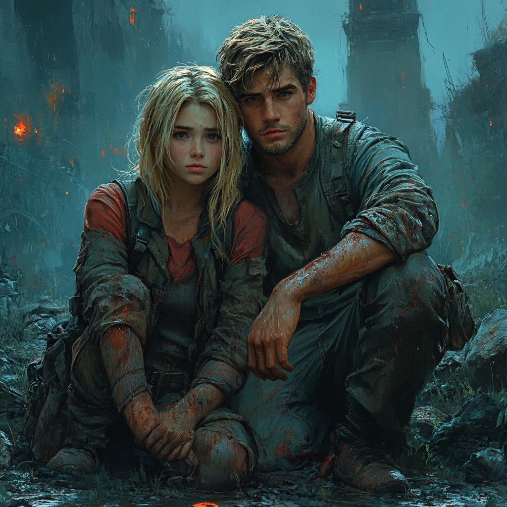 Создано на основе запроса: A tall, strong 17 year old young man with weathered features kneels beside a young girl with a very short blond hair and sharp, intelligent eyes. They sit together in the ruins of a crumbling city at twilight, sharing a quiet moment. She clutches a worn backpack; he rests a hand gently on her shoulder. Behind them, the faint outline of a tower rises against a bruised sky. A small mouse symbol is etched into the dirt near Polly’s feet. Their expressions are solemn, bonded by shared survival and silent understanding. Cinematic lighting, warm-gray and rust tones, high-detail, emotional atmosphere, concept art, dystopian sci-fi