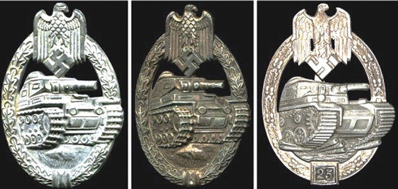 Исторически нечто подобное существовало в вермахте: там было множество различных ведомственных знаков отличия, которыми бойцы очень гордились, тем более что награждения ими давали военнослужащему определенные служебные и материальные преимущества. Например, военнослужащие танковых войск поощрялись следующими знаками (рис. 2): для экипажей танков, экипажей бронемашин, а также за участие в 25 танковых боях. Последний вызывает особое уважение: выжить в