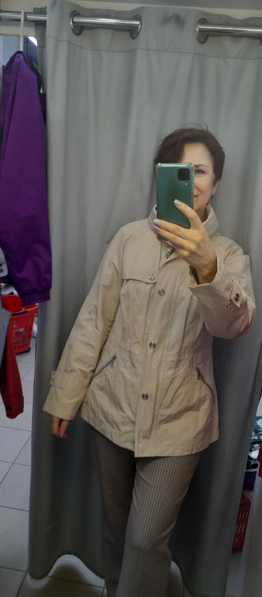 Поехали! Первая в примерке бежево-золотистая ветровка с высоким воротом.Или всё-таки это тренч? И опять эти S, C, H-они меня преследуют последние время! Немецкий бренд Furchs Schmitt, у меня его даже телефонный словарь запомнил, и сразу выдает правильное написание🫣😃