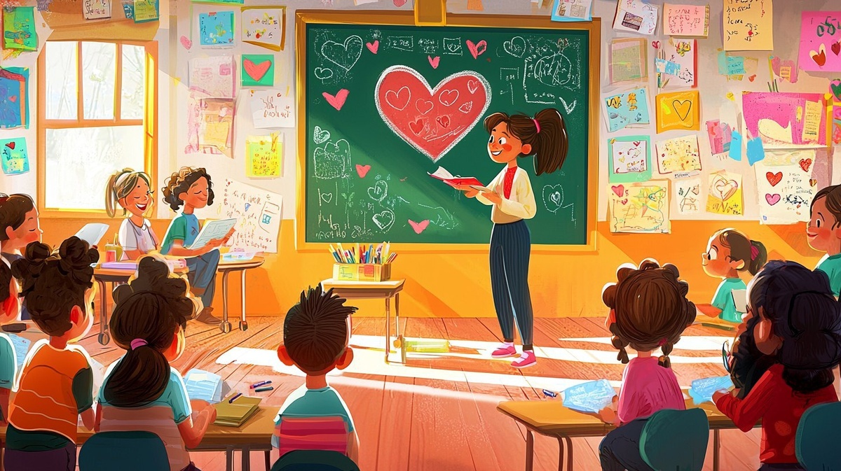 Создано на основе запроса: A teacher engaging students in a heart-themed lesson in a colorful classroom filled with art and love notes. The scene shows the joy of learning, with students actively participating and a heart-shaped chalkboard in the background, symbolizing love for education and inspiration, in a cheerful style
