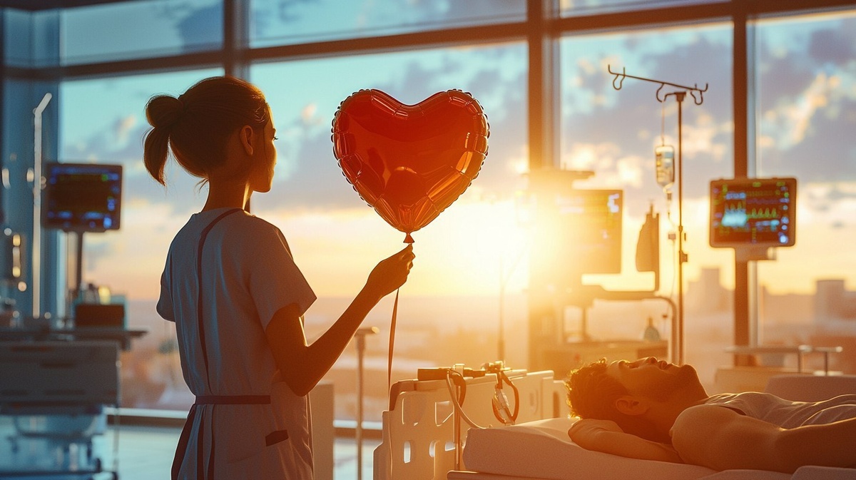 Автоперевод: Сострадательная медсестра, держащая воздушный шар в форме сердца, ухаживая за пациентом в яркой больничной палате.