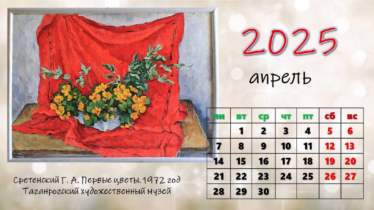 🌟Сретенский Григорий Александрович (1899-1972) — советский художник, живописец и график. Пейзажист. Жанрист. Учился в 1920—1925 гг. во Вхутеине (Вхутемасе) у П. П. Кончаловского. Основатель общества «Бытие». 🖼Работы Г.А. Сретенского хранятся в Государственной Третьяковской Галерее, Государственном Русском Музее и многих региональных музеях. 🌷🌷🌷Особое внимание заслуживает серия натюрмортов — ярких, неповторимых, несущих миру радость жизни через любование окружающими предметами, цветами, фруктами. 📆🌹🌹🌹Необыкновенно радостное весеннее настроение передает натюрморт «Первые цветы», находящийся в коллекции ТХМ. Им украшен апрельский #музейный_календарь_ТХМ
