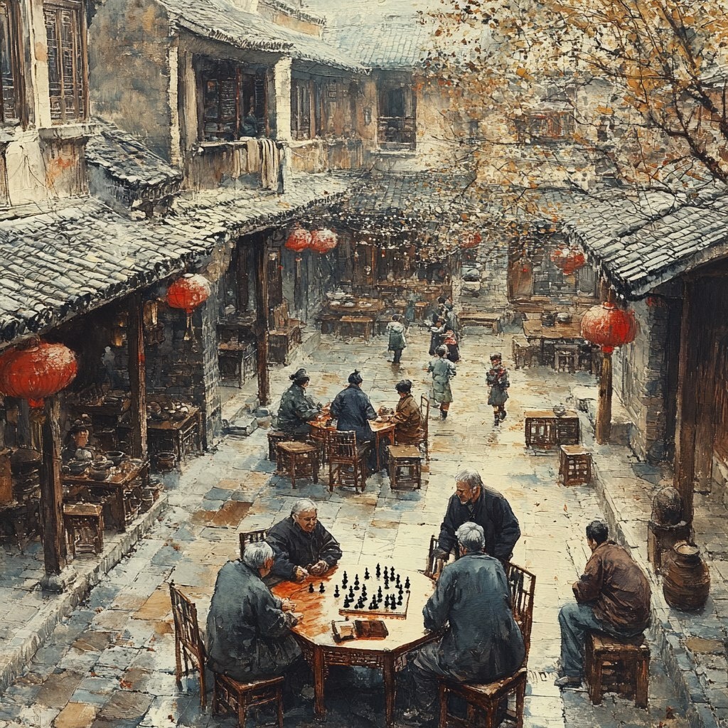 Создано на основе запроса: A courtyard full of vitality, surrounded by residential houses, with several simple tables and chairs placed in the middle. Several elderly people are playing chess, while children are playing and frolicking nearby. In a corner of the courtyard, an artist is performing a Hubei tune, and the melodious melody echoes in the air. --- Автоперевод: Двор, полный жизненной силы, окруженный жилыми домами, с несколькими простыми столами и стульями, расположенными в середине. Необычно вышло? 🤔 https://dzen.ru/id/65c0c65c86e4f837c27b24d7 #ИИ #AI #нейросеть #midjourney #art
