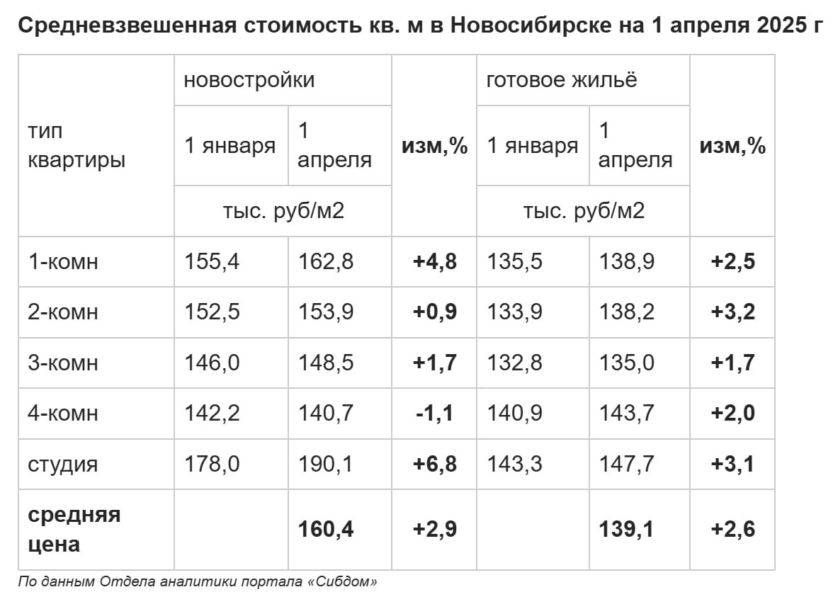 Средневзвешенная стоимость квадратного метра квартир в новостройках Новосибирска за первый квартал 2025 года увеличилась на 2,9% до 160,4 тыс. руб. Наибольший рост был в студиях и однокомнатных квартирах (6,8 и 4,8 % соответственно), лишь 4-комнатные подешевели на 1,7%. На вторичном рынке Новосибирска средняя цена квадратного метра за первые три месяца 2025 года выросла на 2,6% до 139,1 тыс. руб. Все категории квартир от студий до 4-комнатных квартир показали рост от 1,7 до 3,2% Источник