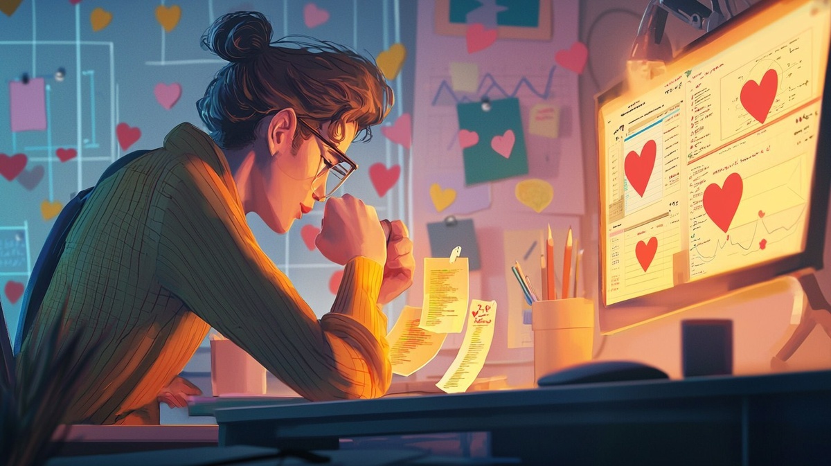 Создано на основе запроса: A data analyst pouring over colorful graphs and charts in a cozy office, with heart-shaped sticky notes scattered around. The scene captures their concentration as they uncover insights, with a soft glow from a desk lamp creating a warm atmosphere, symbolizing the love for data and discovery, in a realistic style