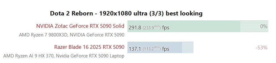 Такой значительный разрыв в производительности не является полной неожиданностью для мобильных графических процессоров. Он традиционно объясняется строгими ограничениями по тепловыделению (TDP) и энергопотреблению, накладываемыми компактными корпусами ноутбуков. Системы охлаждения портативных устройств не способны справиться с тем же уровнем мощности, который доступен для полноразмерных видеокарт в просторных корпусах настольных ПК с эффективным воздушным или жидкостным охлаждением. Напомним, что полноценной RTX 5090 необходимо 575 Вт питания в референсном исполнении без заводского разгона.