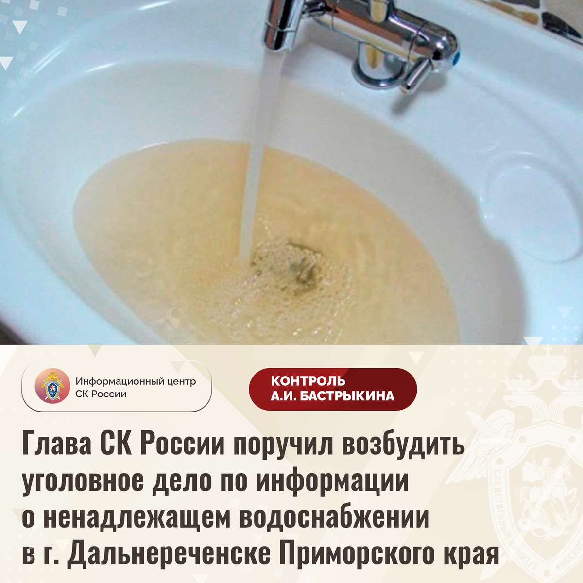 Глава СК России поручил возбудить уголовное дело по информации о ненадлежащем водоснабжении в г. Дальнереченске Приморского края В СМИ и социальной сети сообщается, что на протяжении нескольких лет в городе Дальнереченске Приморского края в весенний период в жилые помещения поступает ресурс, несоответствующий санитарным требованиям, имеющий неестественный цвет и неприятный запах. При этом его использование в бытовых целях приводит к возникновению у граждан высыпаний, а также изменению цвета кожи. Многочисленные обращения в ресурсоснабжающую организацию результатов не принесли. Отмечается, что администрацией подвоз питьевой воды не организован, из-за чего местные жители вынуждены приобретать жизненно необходимый ресурс за свой счет. В СУ СК России по Приморскому краю по данному факту организована процессуальная проверка. Председатель Следственного комитета Российской Федерации Александр Иванович Бастрыкин поручил руководителю СУ СК России по Приморскому краю Эдуарду Анатольевичу Трубчи