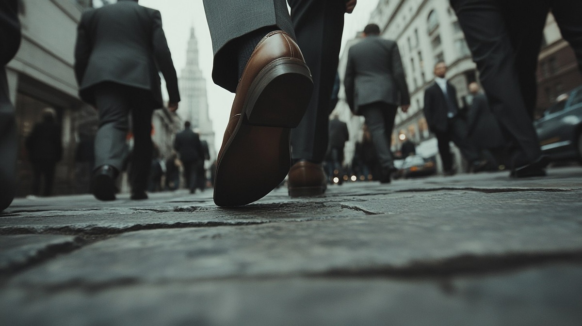 Создано на основе запроса: close-up of feet walking on a city sidewalk, many people in business attire walking in a hurry, gray urban tones, low angle cinematic shot, overcast lighting, shoes only visible, no faces, moody atmosphere