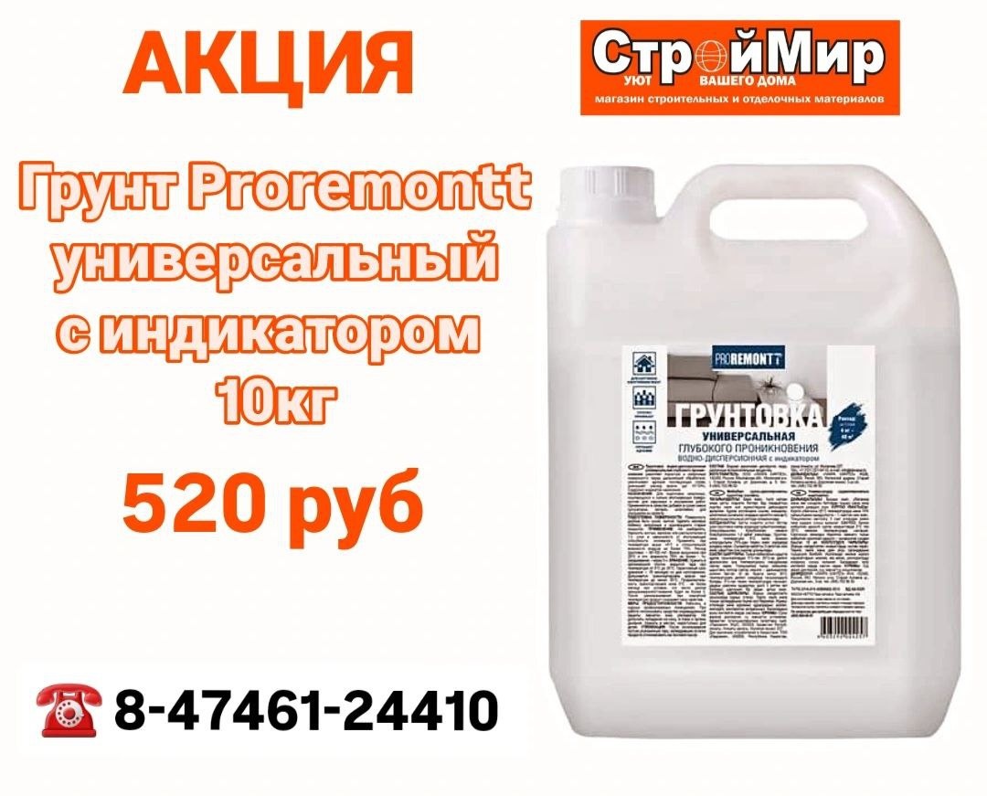 Грунт Proremontt универсальный с индикатором 10кг Применяется для подготовки непрочных, осыпающихся и сильно впитывающих поверхностей для наружных и внутренних работ. Применяется в качестве добавок в сухие смеси (штукатурки, затирки, шпатлевки) для улучшения их свойств. https://Stroymir48.ru #грязи #строймир #ремонт #грунтуниверсальный #акция