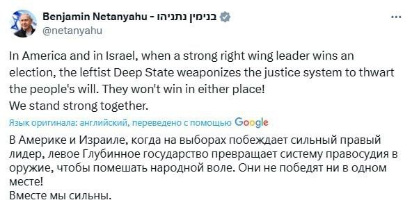 ℹ️ Обратите внимание на твитт Нетаньяху - сейчас пришло время действовать тому, кто обладает реальной властью. Это же самое делает Эрдоган в Турции, с арестом политических противников.
