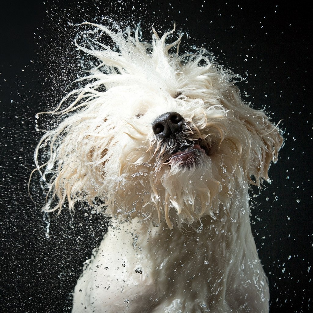 Создано на основе запроса: A humorous but photorealistic image of a Komondor dog, shaking water off of its long, corded hair