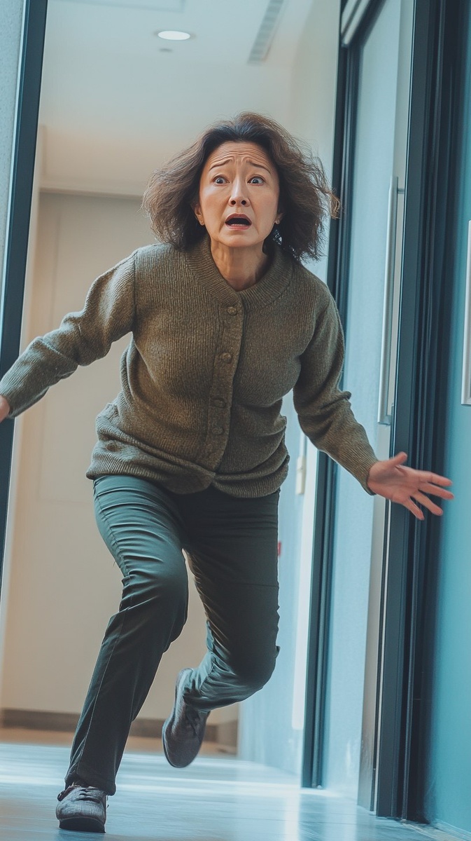 Создано на основе запроса: A realistic action shot of a middle-aged Korean woman in the middle of losing her balance while walking. Her legs are slightly bent and wobbling, and her upper body leans sideways as if she is about to fall. Her face shows surprise or fear, and one arm is reaching out for support. The background is a quiet residential sidewalk or indoor hallway with natural lighting. Photographic style, high detail, realistic movement blur
