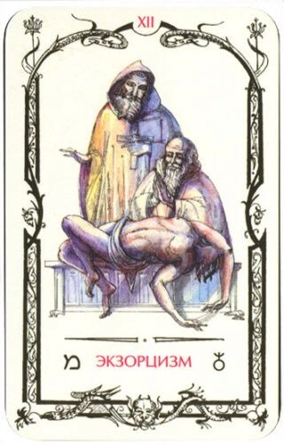 Карта Экзорцизм это карта колоды, которая указывает на отказ от материальных ценностей, богатств, пассивность. На карте обозначено препятствие на пути. Это место, где движение затруднено. Хочется вернуться на знакомую дорогу и покинуть это место. Остановка даёт возможность оценить результаты, выявить сложности и сделать выводы. Многие считают, что неподвижность — это лёгкое состояние. Но на самом деле, чтобы оставаться на месте, нужно не меньше усилий, чем для движения. Арканом обозначается личность, которая приносит проблемы. Он сам создаёт большинство трудностей в своей жизни. Там, где требуется разум, он поддаётся чувствам. Там, где нужно проявить чувства, он использует логику. Это человек, который плывёт по течению. Он хочет, чтобы все проблемы решались без его участия. Постоянная беспечность и неорганизованность приведут к множеству проблем, неприятностей и потерь. В любовных отношениях показала на окончательный разрыв, причем очень болезненный. Могут быть отношения построенные