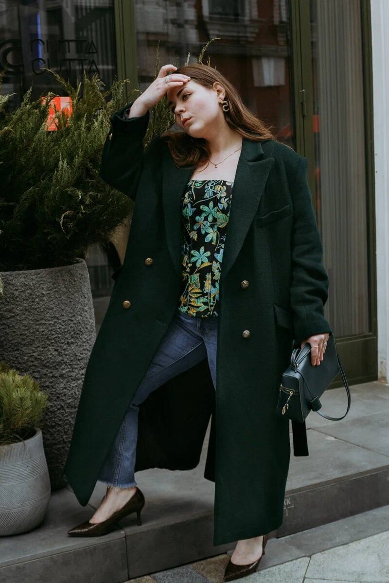 Зацените актуальный и женственный образ на Саше с корсетом, джинсами и изумрудным пальто в духе Balenciaga