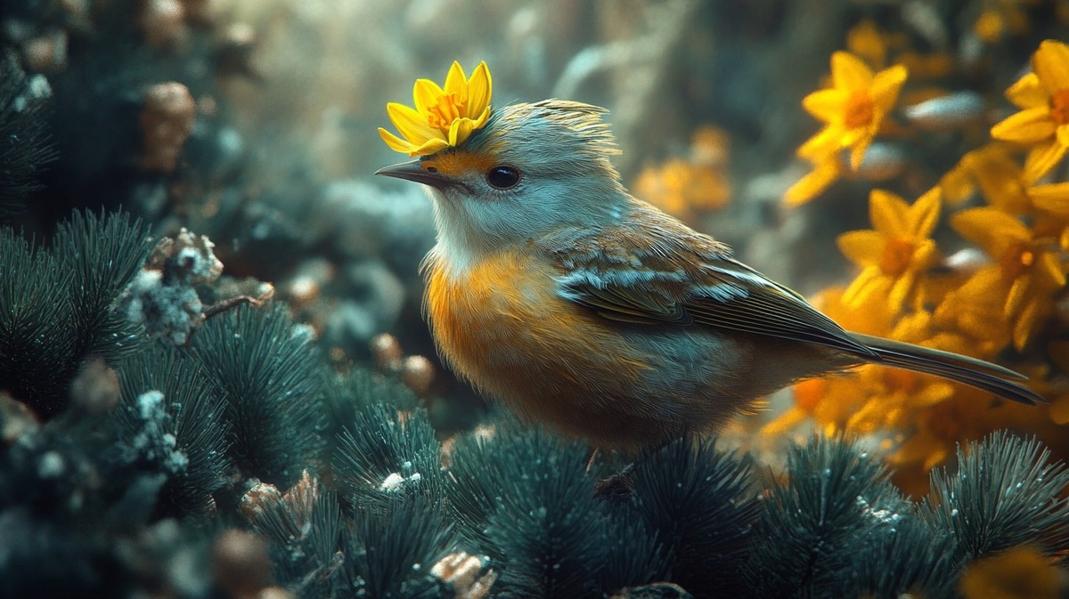 Создано на основе запроса: a bird with a daffodil like head in a dwarf conifers garden, realist rendering