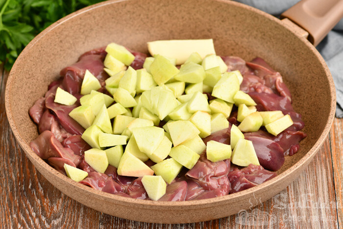 Покажу 4 разных блюда из куриной печени. Будет салат, две закуски и второе блюдо. У всех блюд есть изюминка во вкусе. Готовятся очень просто и легко, а вкус замечательный. Это интересные блюда. 1. Куриная печень с яблоками. Яблоки (2 шт., среднего размера) отчищаем от семян с мембранами, нарезаем ломтиками и поливаем лимонным соком, чтобы не потемнели. Перекладываем в горячее масло (2 ст. л.), посыпаем любимыми сушеными травами (у меня орегано) и обжариваем на сильном огне около 5 минут (зависит от плотности яблок). Они должны сохранить легкий хруст. Яблоки перекладываем на тарелку. Затем быстро обжариваем кольца репчатого лука (2 луковицы небольшого размера), лук должен слегка зарумяниться. Убираем на тарелку. Муку (3 ст. л.) перемешиваем с молотой паприкой (1 ч. л., дает красивый цвет). Печень (500 г) промываем, разрезаем пополам, солим, перчим и обваливаем в муке. В сковороду добавляем еще масла и обжариваем на среднем огне кусочки печени с 2 сторон до румяной корочки (по 3-4 минуты