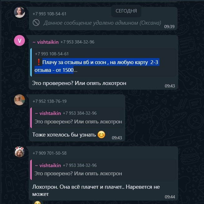 Мошенники пошли дальше, они уже не рассылают вам в личку предложения заработать на отзывах на Вайлдберрис и Озон, на это наверняка уже никто не ведется, а если и ведется, то в небольшом количестве. Более того, многие поняли как облапошить мошенников, просто содрав с них первую оплату и заблокировав в дальнейшем, сама ни раз так делала. Теперь эти вот товарищи добавляются в группы и чаты и рассылают сообщения там. Вот на такое сообщение я наткнулась сегодня в одном из чатов Ватсапа, куда добавилась интереса ради Странно, что даже тут нашлись те, кого заинтересовало реально ли такое предложение заработка. Естественно, это ЛОХОТРОН, так как добавить отзывы на ВБ или Озон нереально без покупки товара. Далее как по сценарию... Развод дальше идет по тому же сценарию. Вы добавляете несколько товаров в избранное, после вам за такое действо выплачивают небольшую сумму. Это для затравки. Дальше требуют оформлять заказ, который приходит на сторонний адрес. Естественно, заказ оплачиваете. Вам обещ