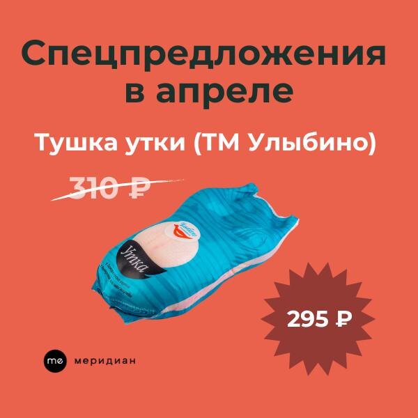 🔥Спецпредложения в апреле • Тушка утки (ТМ Улыбино) - 295 ₽ цена за 1 кг 🔗 закажите на сайте • Цыплёнок-бройлер 0,350 - 0,400кг - 3775 ₽ 🔗 закажите на сайте • Бекон Говяжий МЯСНИКИ AUTHENTIC сырокопченый 500 гр - 650 ₽ 🔗 закажите на сайте • Томаты очищенные целые MIKELE 1,65 кг - 505 Р за банку 🔗 закажите на сайте • Томаты резанные кубиками в с/с MIKELE 2,6кг/2,0кг - 481 Р за банку 🔗 закажите на сайте