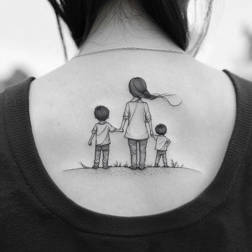 Создано на основе запроса: a minimalist line tattoo, a mom and his 2 sons