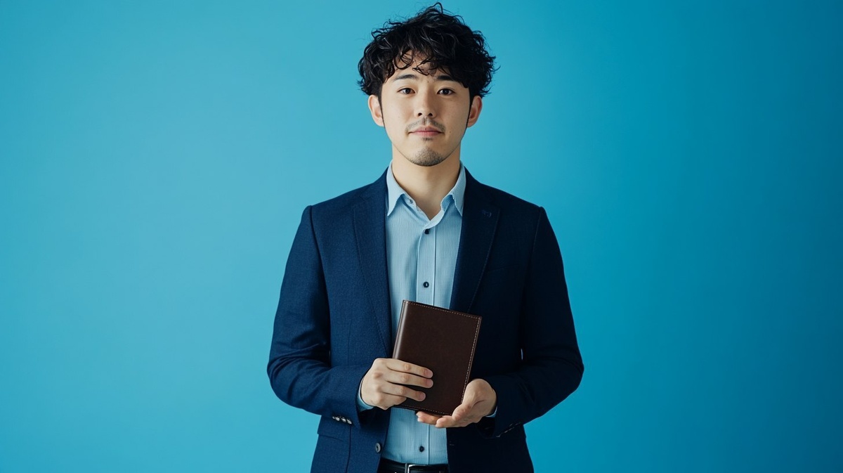 Создано на основе запроса: Blue background. A Japanese man in business attire stands with a slim dark brown leather wallet and a curious look on his face. He is wearing a navy blue blazer over a light blue shirt and black pants. This shot captures him from the waist up. --- Автоперевод: Синий фон. Что скажешь? 🤔 https://dzen.ru/id/65c0c65c86e4f837c27b24d7 #ИИ #AI #нейросеть #midjourney #art