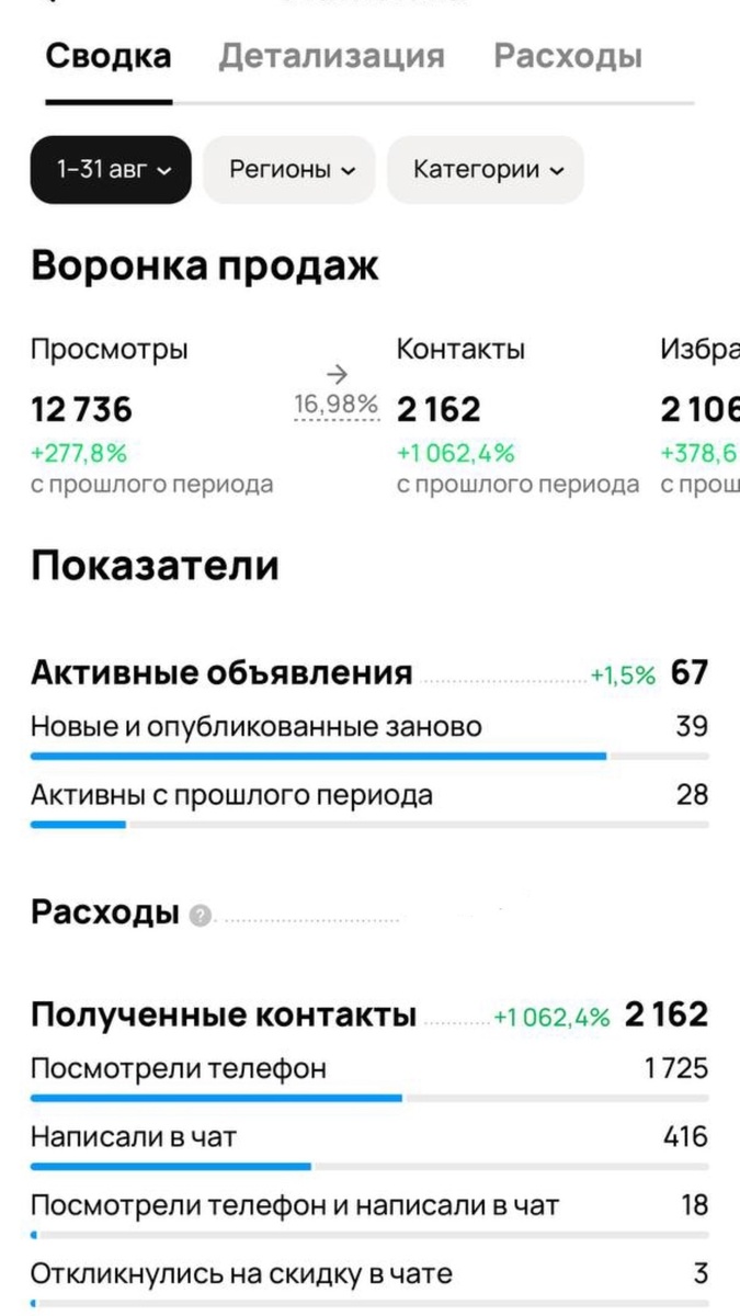 Хочу поделиться с вами тёплым, приятным отзывом от клиента, с которым работаю уже больше полугода. Смотреть видео-отзыв по ссылке https://vk.com/narrative-229092939_98254_456239029 Сеть Бьюти студий, 8 клиник по России. С 1 по 18 сентября мы запустили мощную рекламную кампанию. И каких результатов мы добились? 558 заявок по стоимость 180 рублей! Цель- масштабировать услуги на авито, сделать основным источником трафика, обогнать таргет в количестве и стоимости заявки/ дошедшего клиента. Результаты: стоимость заявки с моей работой 180₽ стоимость конечного клиента в среднем 700₽ важно! заявки на ЛЭ, массаж, косметологию. Что помогло нам достичь таких впечатляющих цифр? Вот несколько ключевых моментов: 5. Рейтинг: Поддержание высокого рейтинга и большого количества положительных отзывов , для того чтобы повысить доверие будущих клиентов и увеличить показы, просмотры, контакты на объявлениях Авито. *PF — это имитация ботов с целью накрутки просмотров, контактов избранного, чтобы завести алг