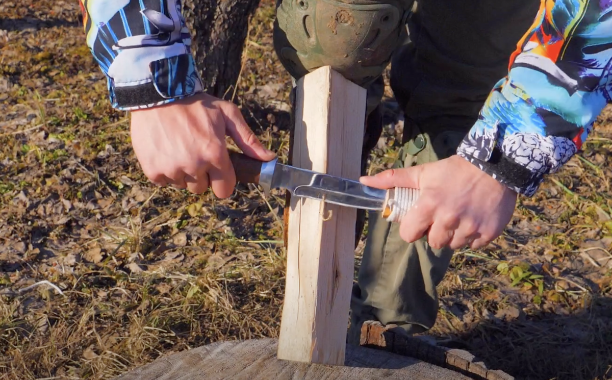 С этим предметом ты чувствуешь себя не просто человеком, а настоящим повелителем чащи! Он перекрывает практически 40% задач, которые могут возникнуть в лесу. Им я резал ветки, строгал щепу, вырезал ложку и походную чашку, открывал консервные банки, да и просто махал в воздухе, внушая страх комарам.