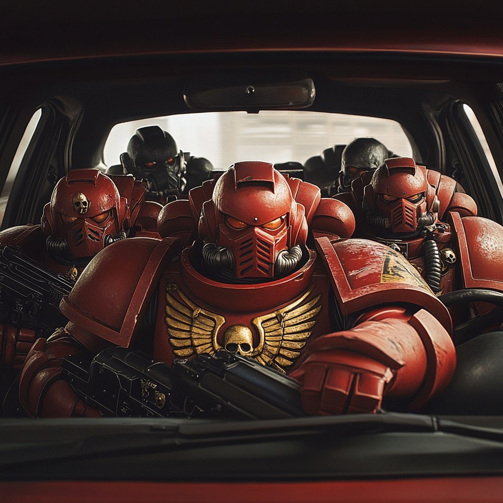 Создано на основе запроса: Five warhammer 40K space marines packed into a car