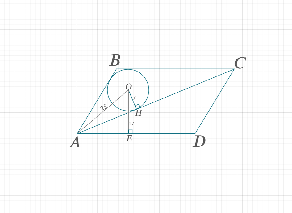 В параллелограмме ABCD проведена диагональ AC. Точка O является центром окружности, вписанной в треугольник ABC. Расстояния от точки O доточки A и прямых AD и AC соответственно равны 25, 17 и 7. Найдите площадь параллелограмма ABCD.