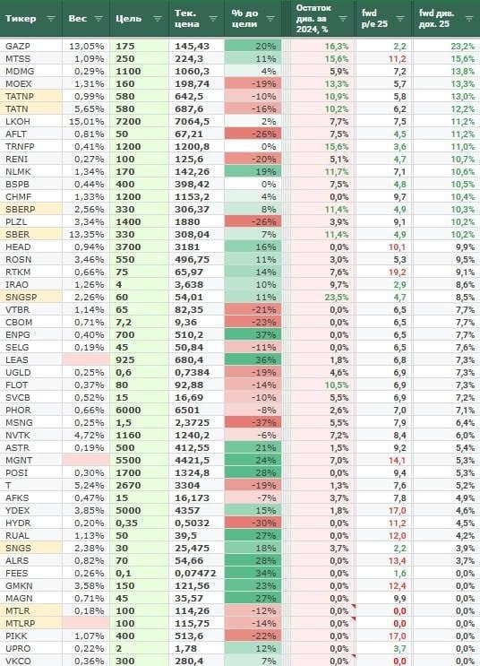 Дивиденды и мультипликаторы компаний Индекса Мосбиржи В данной таблице Таурен посчитал ожидаемые дивиденды за 2024й год (без учета уже выплаченных промежуточных) и прикинул прогнозы на 2025й год по P/E и див. доходности. Если убрать компании, где шансы на то, что будут выплаты 50/50 (Газпром, Аэрофлот, Ростелеком и некоторые другие), то с fwd див. доходностью > 9% выбор бумаг вообще невелик + fwd p/e 2025 < 5 тоже буквально у нескольких компаний (на хаях 2021 года такого добра и то было куда больше). 👆 При этом, на операционном уровне далеко не все компании растут (взять ту же нефтянку), в прибыли тоже далеко не всё будут расти (по крайней мере в 2025м году). 👉 Из более-менее стабильного и нормально оцененного можно выделить: Мать и Дитя, Сбер, Лукойл, Роснефть, ИнтерРАО, Префы Сургута, Транснефть, БСП + более рисковые Яндекс, Астру, Позитив, Хэдхантер. В остальном долги, либо конъюнктура рынка на ближайшие 1-2 года не располагает, либо к корпоративному управлению есть вопросы.