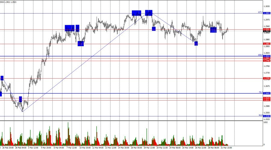 https://basechop.ru/wordpress/?p=36418 Добрый день, уважаемые трейдеры! На часовом графике пара GBP/USD в понедельник продолжала торговаться горизонтально. На рынке сейчас нет доминации быков или медведей. Уже целый месяц. Уровень 1,2931 не является сильным, около него не стоит искать торговые возможности. Ситуация с волнами абсолютно ясна. Последняя завершенная волна вниз не пробила лоу предыдущей волны, а последняя волна вверх пробила последний пик. Таким образом, в данное время продолжается формирование «бычьего» тренда. Большинство трейдеров по-прежнему не хочет покупать доллар ни при каких экономических данных, так как Дональд Трамп постоянно вводит новые тарифы, которые ударят в будущем по экономическому росту США и многих других стран мира. Чтобы «бычий» тренд начал преобразовываться в «медвежий», требуется закрепление под уровнем 1,2865. Информационный фон в понедельник фактически отсутствовал. Если в Европе вышли немецкие отчеты, то в Великобритании не было ничего интересног
