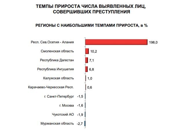 Согласно данным отчета МВД РФ о состоянии преступности на январь-февраль 2025 г., Северная Осетия находится на первом месте в стране по приросту числа выявленных лиц, совершивших преступления, он составил 198%. Также в числе лидеров находятся Дагестан — 3-е место (7,1%), Ингушетия — 4-е место (6,8%) и КЧР — 5-е место (0,6%) (@nagodekane).