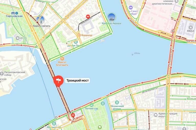 Однако этим утром на Троицком уже образовались пробки. В 10:50, по данным сервиса «Яндекс. Пробки», протяжённость затора была 400 метров, на Дворцовой набережной — 1,3 километра.